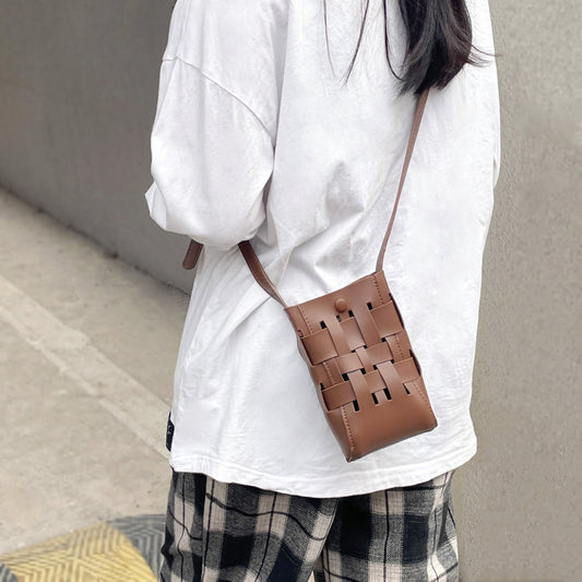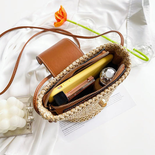 Mini PU Mix Raffia Straw Bucket Crossbody Bag